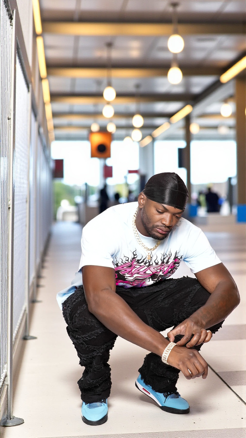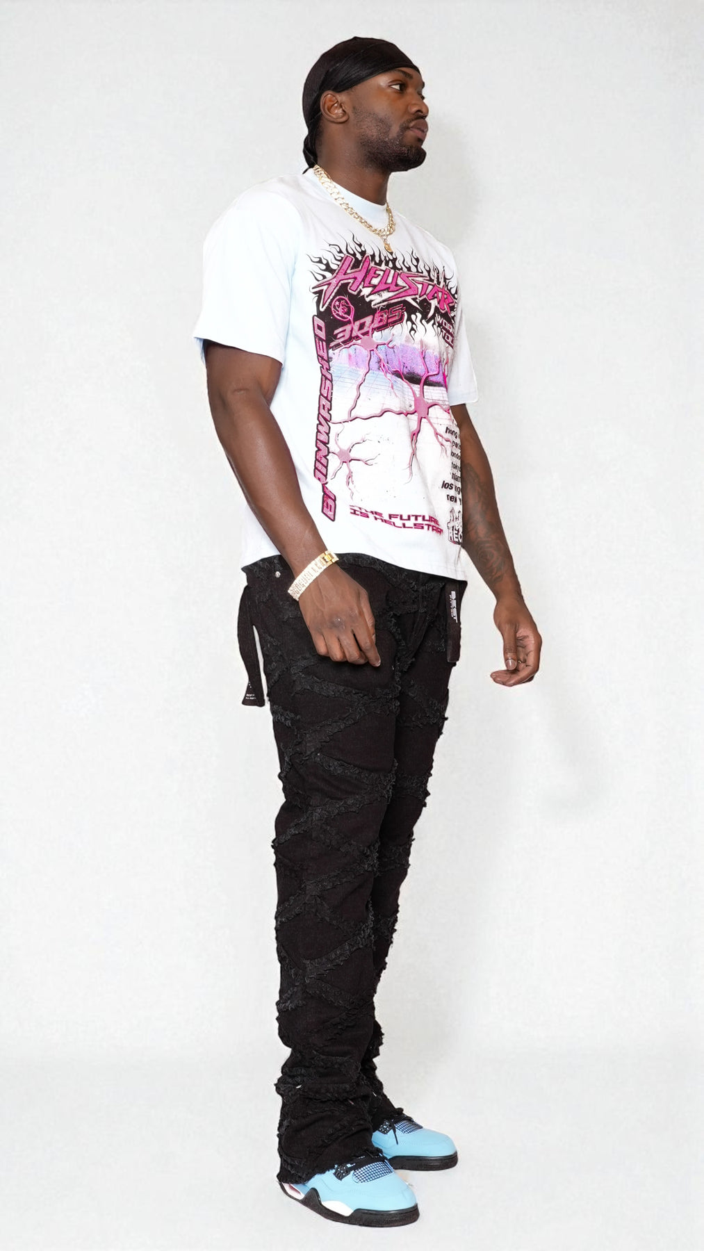 Built for bold fit pics. These all-black jeans feature raised, frayed criss-cross bands wrapping each leg for a striking 3D texture. Cut slim through the thigh with an extended inseam for clean stacks over sneakers, they deliver a sleek silhouette with street impact.