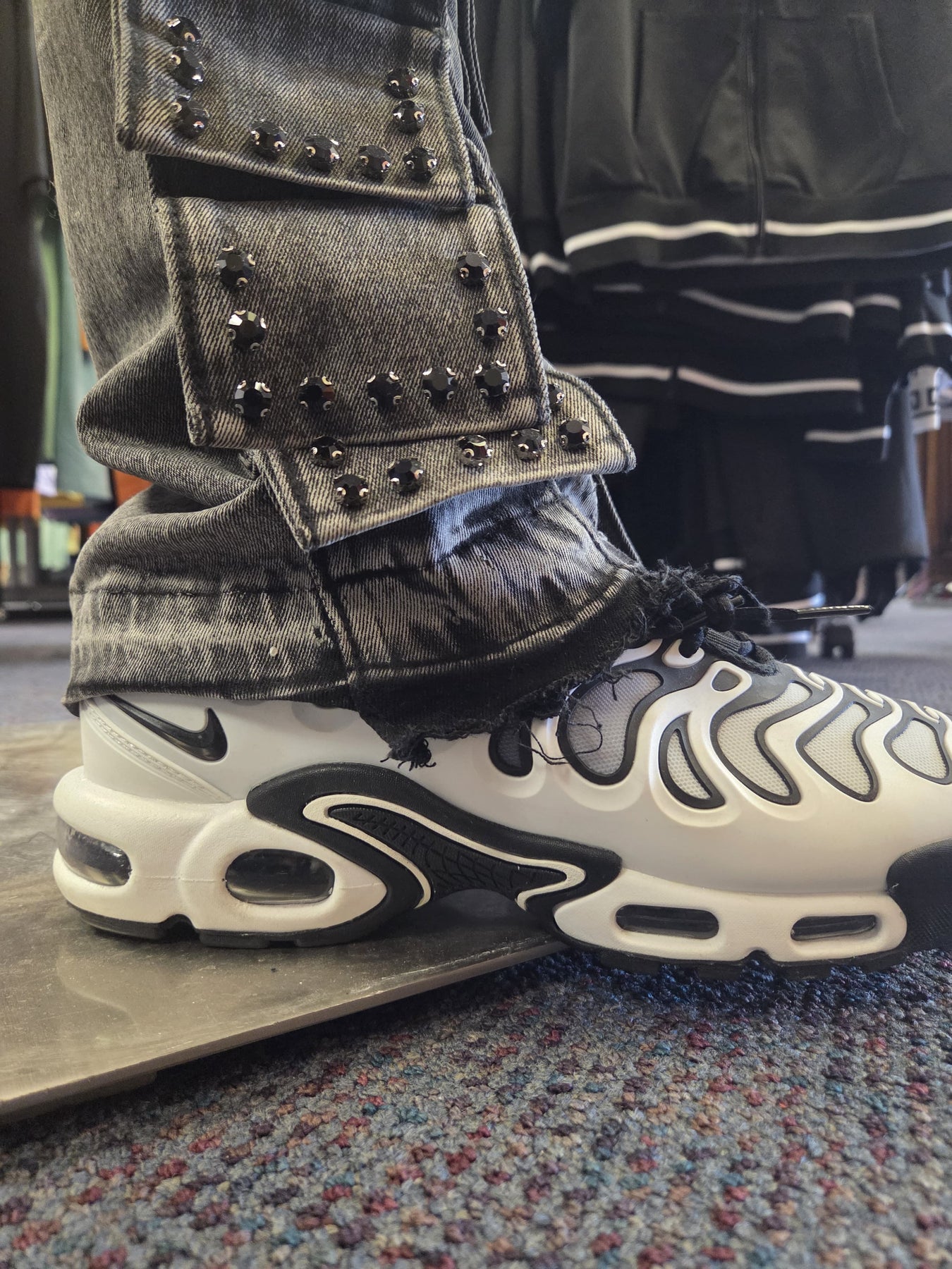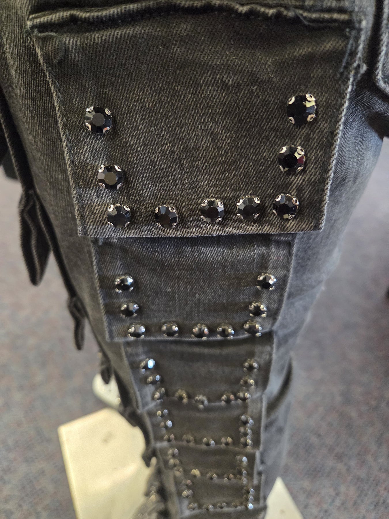 Overall Aesthetic: The combination of the dark wash, metal studs, and aggressive layering gives the jeans a very bold, edgy, and high-texture look. They are clearly a statement piece.